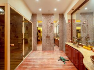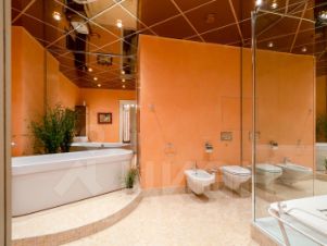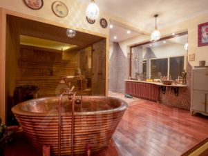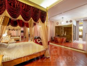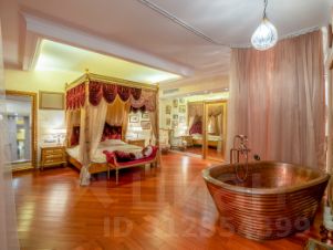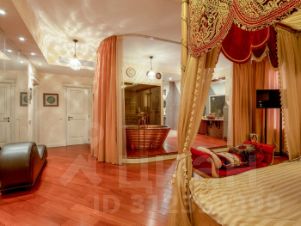 Слева от входа расположена гостевая мастер-спальня. Другая спальня наполнена зеркалами, в них отражается уникальная кровать с балдахином. За зеркальными стенами и дверями с золотой рамой скрыта еще одна гардеробная. Напротив кровати на подиуме расположена уникальная медная ванна, доставленная по спецзаказу из Америки. Справа от ванной открытый душ в мозаике с зеркалами. Рядом столешница из мрамора со встроенной медной раковиной и заглубленным зеркалом в золотой раме. Деревянные полы и съемная решетка в душе выполнены из тика. За ванной разместилась сауна со стенами из дымчатого стекла. Подиум-сцена может закрываться полностью шторами. Санузел с небольшим золотым рукомойником расположен рядом с подиумом как отдельное помещение.