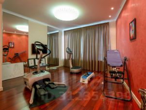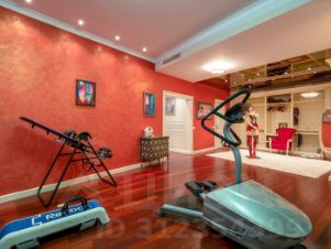 Рядом с прихожей находится также гостевой сан.узел, стиральная и сушильная машины. Небольшой коридор ведет в просторное помещение слева с тренажерами и гардеробной справа. Итальянская фабрика Zonta выстроила шкафы цвета слоновая кость и остров для гардеробной. Собственник этой фабрики приезжал и на замер гостиной и кухни. В центре помещения расположен электрический камин. А мебель в виде крупных акцентных торшеров и ламп итальянских и французских производителей оживляет интерьер.