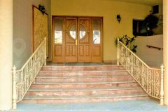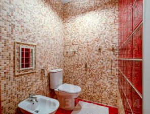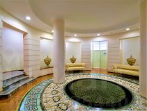 В фойе дома с мозаичным полом и колоннами расположено место сотрудника охраны, контролирующего вход посетителей.