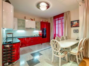 Гостевая зона квартиры удачно спланирована: из прихожей мы попадаем в большую кухню-гостиную с выходом на лоджию с зимним садом, которая смотрит на театр и школу. В зимние вечера здесь можно отдыхать не только со своей семьей, но и со своими друзьями. Отметим, что в кухне установлена вся необходимая техника, большой стол, за которым сможет собраться вся семья.