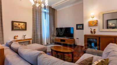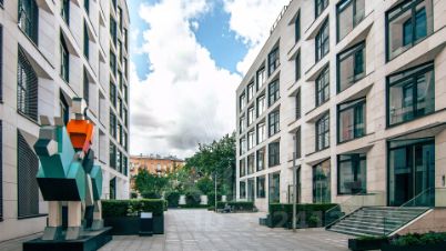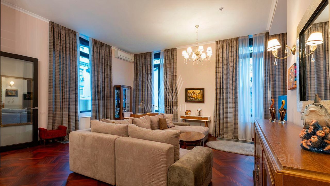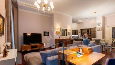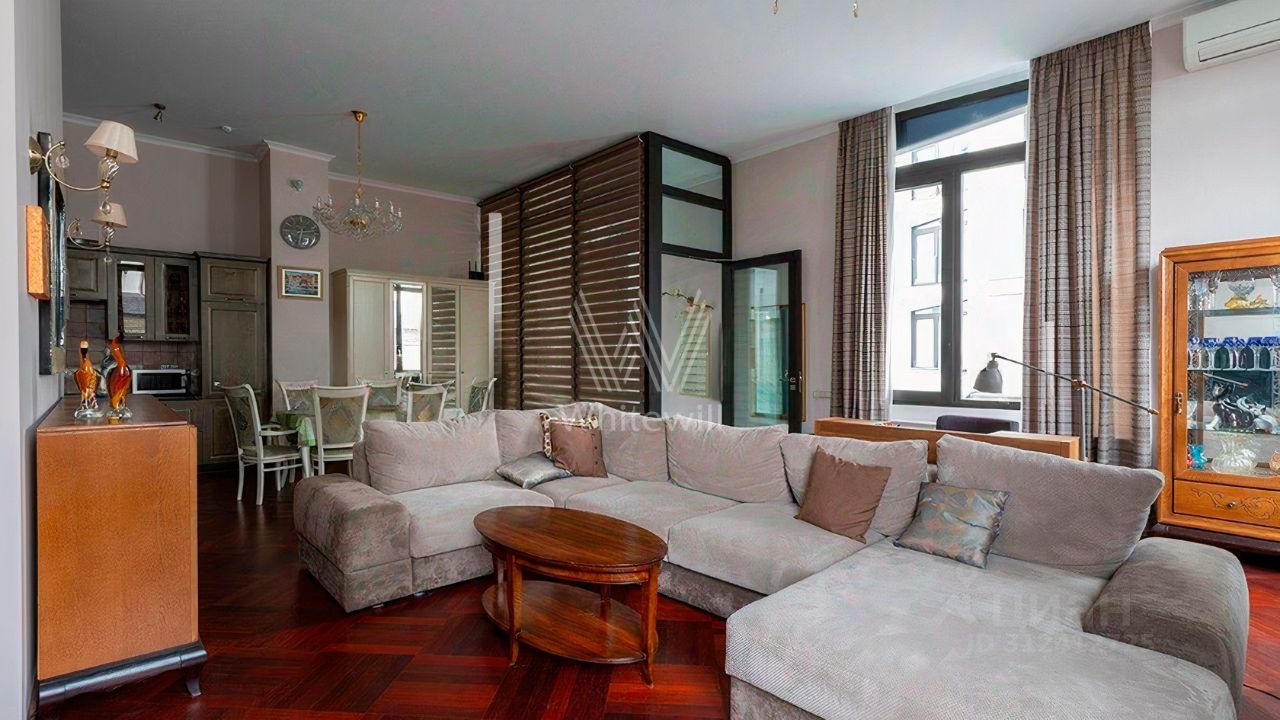 Апартаменты с одной спальней в комплексе премиум-класса Balchug Residence. Апартамент расположен на первом этаже в первом корпусе. Выполнена авторская отделка в стиле современной классики, на полу уложены паркетная доска в форме "французской ёлочки" и плитка. Установлена система индивидуального кондиционирования. Высота потолков — 3,3 метра. Функциональная планировка включает просторную кухню-гостиную с обеденной зоной, спальню со своим санузлом, гостевой санузел и холл. Широкоформатные окна ориентированы на две стороны, открываются виды Никольскую церковь и благоустроенную территорию комплекса.