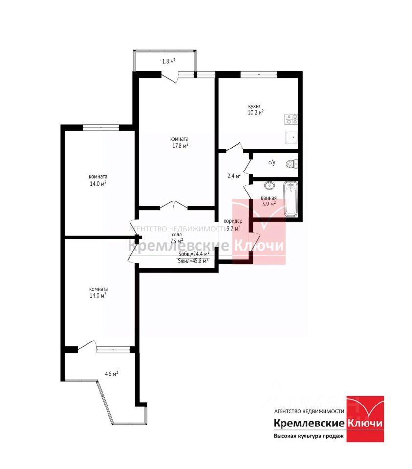 Общая площадь квартиры 74,7 кв.м без учёта лоджии и балкона. Жилая 45,8 кв.м, комнаты изолированные ( 17,8 кв.м ; 14 кв.м; 14 кв.м), просторная кухня 10,2 кв.м, с/у раздельный, большая просторная прихожая. Состояние- жилое.