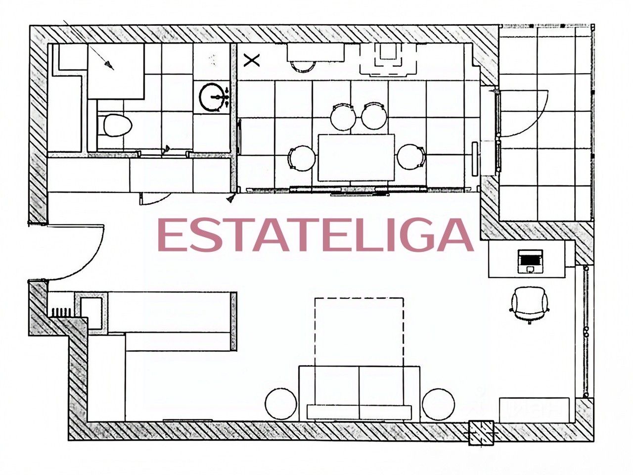 Функциональная планировка квартиры, разработанная по индивидуальному дизайн-проекту: кухня с выходом в лоджию с панорамным остеклением, спальная комната, совмещенный санузел, холл с местами для хранения.
