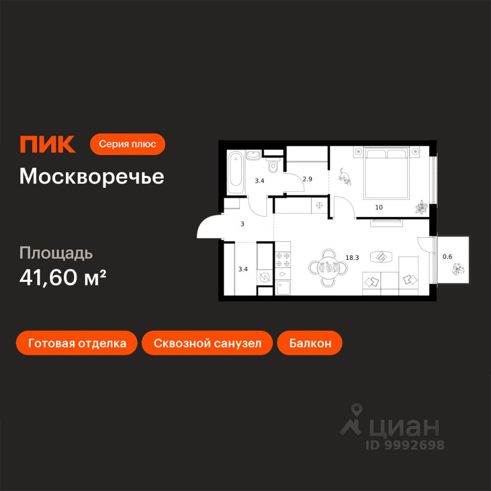 Продаётся 1-комн. квартира площадью 41,6 кв.м на 2 этаже 37 этажного дома (Корпус 1.1, Секция 1) проекта ПИК Москворечье. Светлый просторный подъезд на уровне земли, функциональная планировка, большие окна, c отделкой.