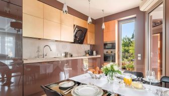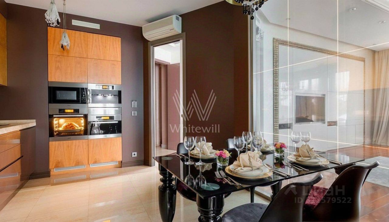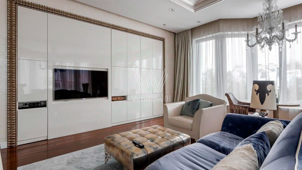 Квартира площадью 234 м² с уникальным авторским дизайном в стиле современного "арт-деко" в комплексе "Покровский берег" на Химкинском водохранилище. Отделка выполнена с использованием натуральных материалов, мебель известных итальянских брендов. Организована удобная планировка, просторный холл с ротондой, декорированной авторскими витражами и мраморными полами, соединяет между собой три жилых пространства. Из окон открываются живописные виды на парк, "Химкинское водохранилище" и поселок "Покровские Холмы".
