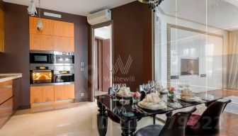 Первый блок — общественная зона: гостиная-столовая с панорамными окнами, с полами из красного дерева, мебелью Ipe Cavalli и венецианскими люстрами Barovier&Toso, кухня из массива оливы с рабочей поверхностью из травертина с техникой Miele и балконом, уютный кабинет с потолочной фреской и рабочим столом в белой коже.