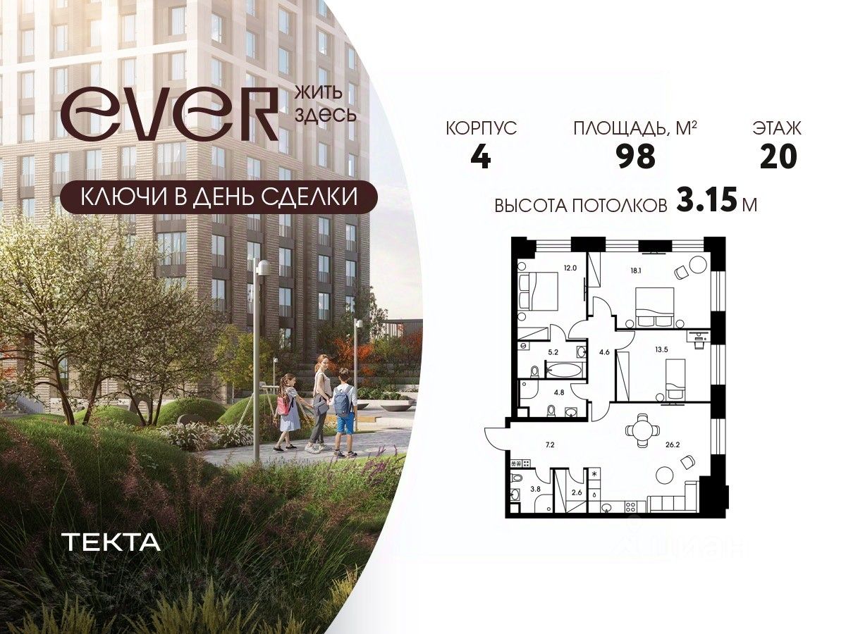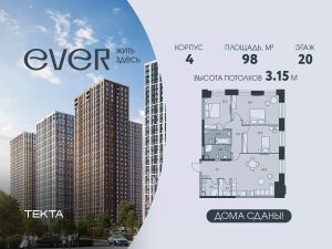 4-комн. квартира в ЖК "Ever" на 20 этаже в 34 этажном здании Корпус 4. Общая площадь: 98 кв.м., жилая: 61.6 кв.м. Высота потолков 3.15 м.