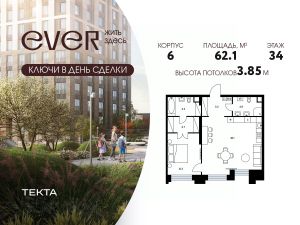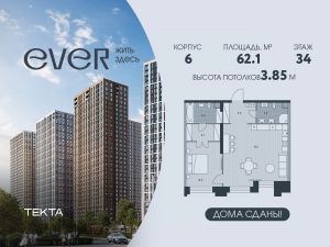 2-комн. квартира в ЖК "Ever" на 34 этаже в 34 этажном здании Корпус 6. Общая площадь: 62.1 кв.м., жилая: 36.0 кв.м. Высота потолков 3.85 м.