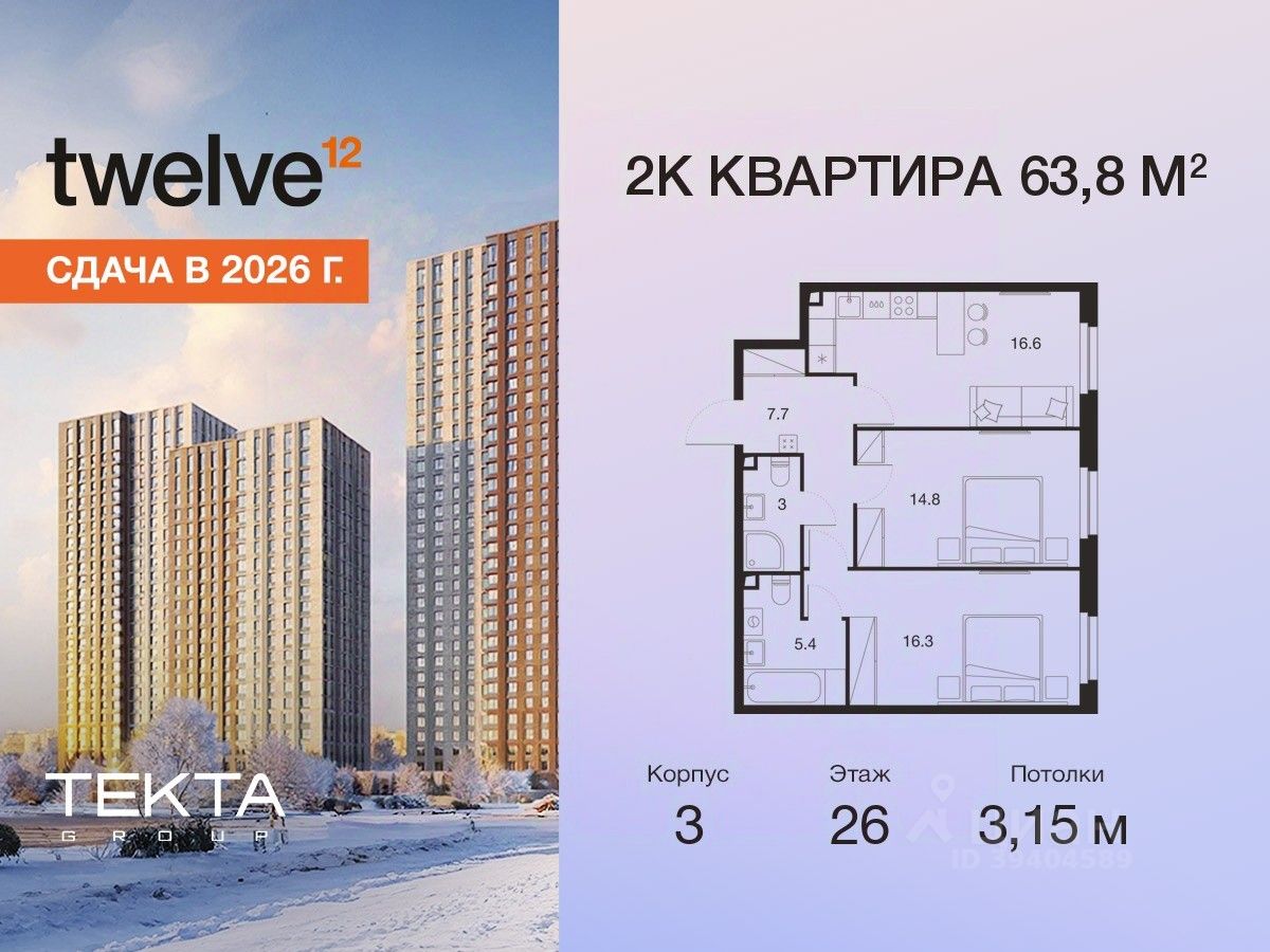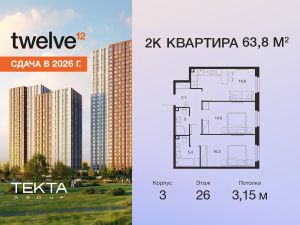 2-комн. квартира в ЖК "Твелв" на 26 этаже в 28 этажном здании Корпус 3. Общая площадь: 63.8 кв.м., жилая: 31.10 кв.м. Высота потолков 3.15 м.
