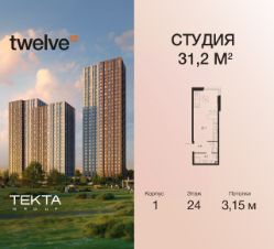 1-комн. квартира-студия в ЖК "Twelve" на 24 этаже в 34 этажном здании Корпус 1. Общая площадь: 31.2 кв.м., жилая: 14.20 кв.м. Высота потолков 3.15 м.
