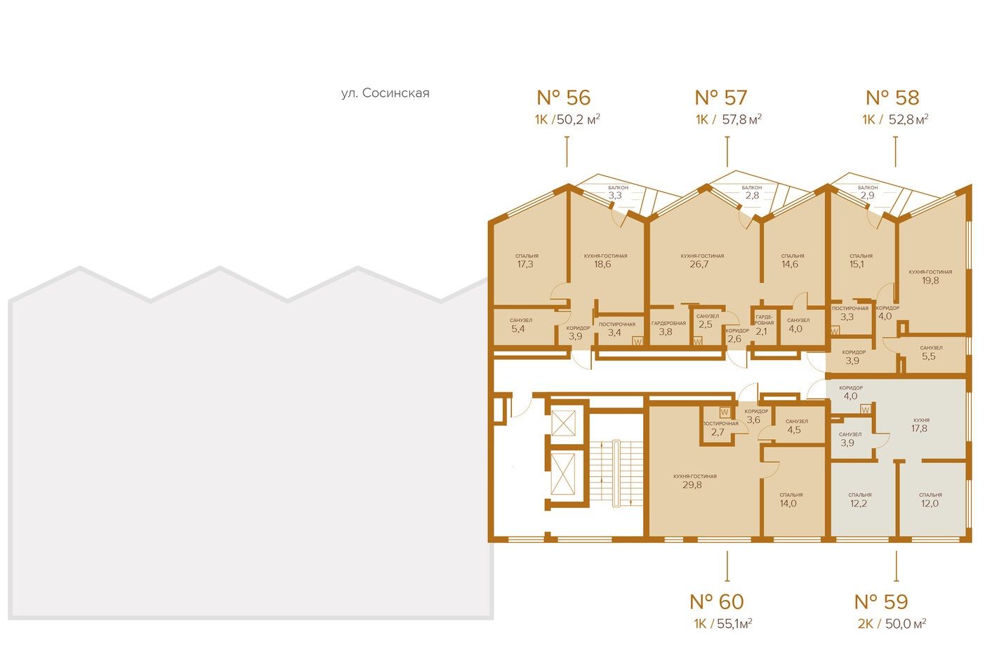 - Малая этажность: три корпуса высотой от 6 до 13 этажей на 238 квартир.