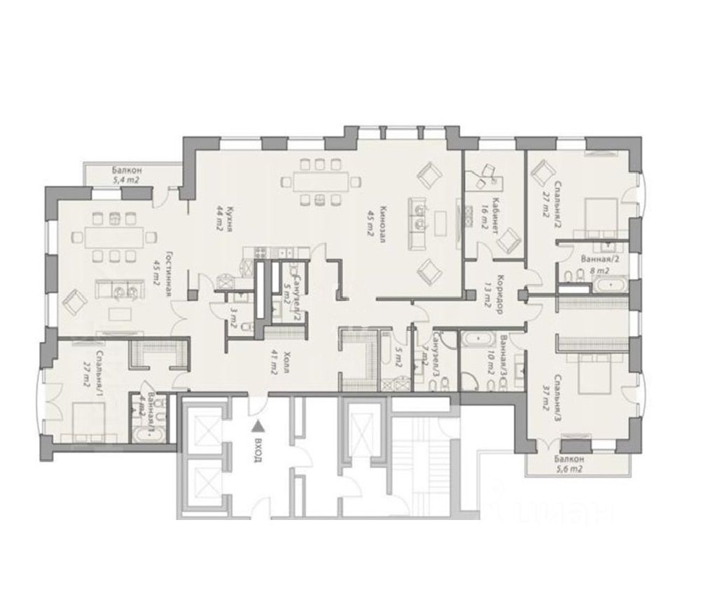 Многофункциональная свободная планировка включает: кухня-столовая, гостиная, четыре спальни с собственными гардеробными и с/у, кабинет, гостевой с/у.
