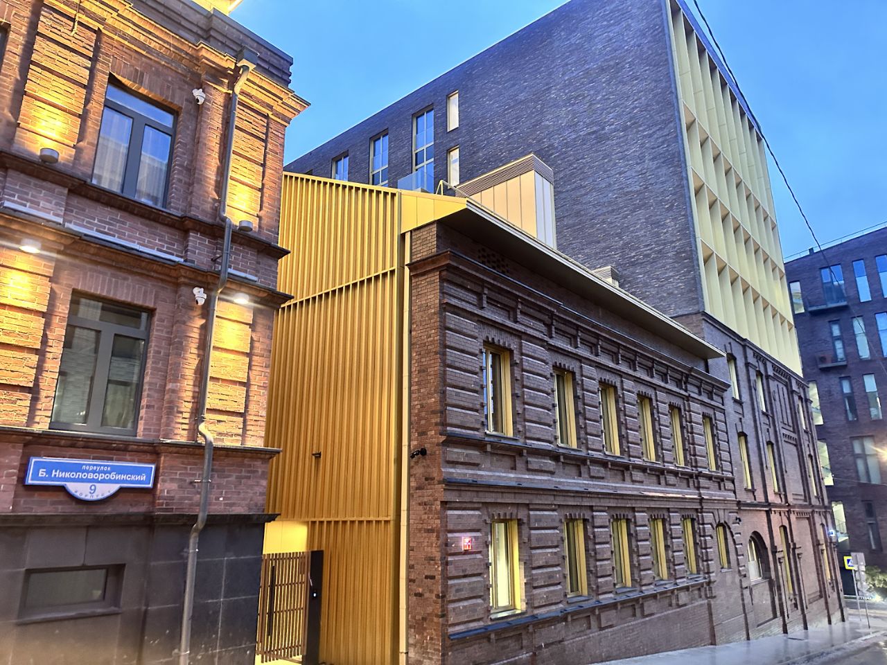 В современной части дома — датский кирпич Petersen Tegl, один из самых дорогих кирпичей в мире. Его форма напоминает плинфу, тонкий обожженный кирпич, который использовали при строительстве Успенского собора Московского Кремля и подклета сеней Грановитой палаты.