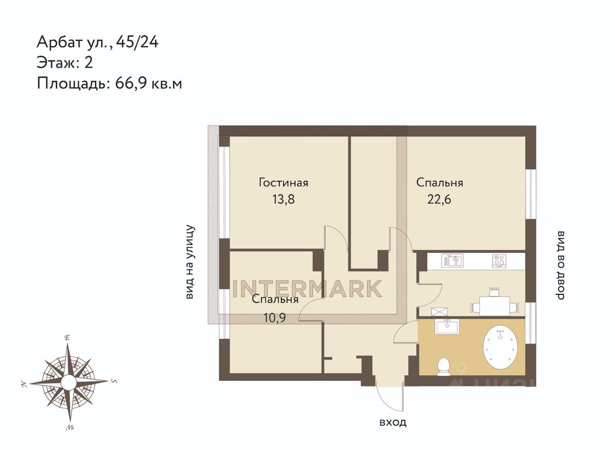Комфортная планировка: отдельная кухня, гостиная комната с красивым полукруглым окном, 2 спальни, большой с/у с окном и холл. Высокие потолки 3,8 метров создают ощущение простора и воздушности жилому пространству. Окна выходят на две стороны: в небольшой тихий дворик и на знаковую пешеходную улицу, известную как Старый Арбат.