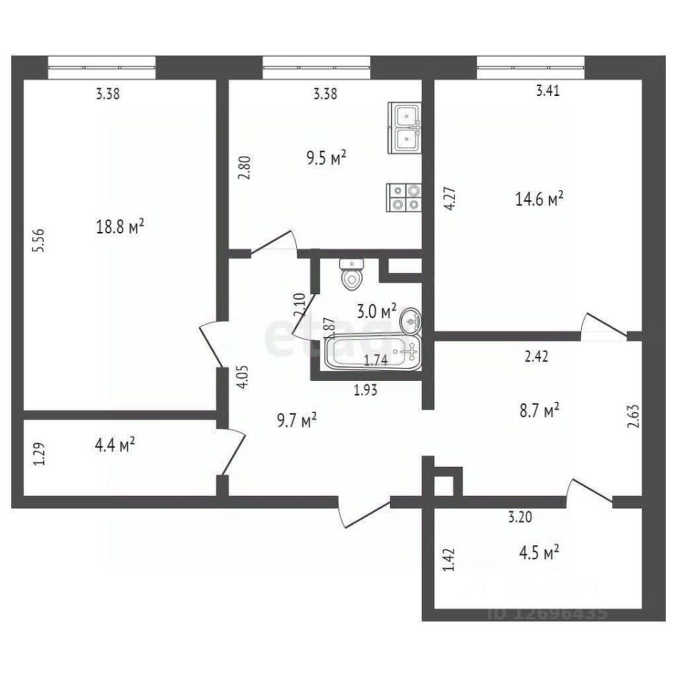 - Три комнаты с площадями: 14,6 | 8,7 | 18,8 кв. м.
