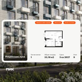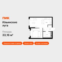 Продаётся 1-комн. квартира площадью 33,16 кв.м на 9 этаже 9 этажного дома (Корпус 3.2, Секция 3) проекта ПИК Ильинские луга. Светлый просторный подъезд на уровне земли, функциональная планировка, большие окна, предчистовая отделка.