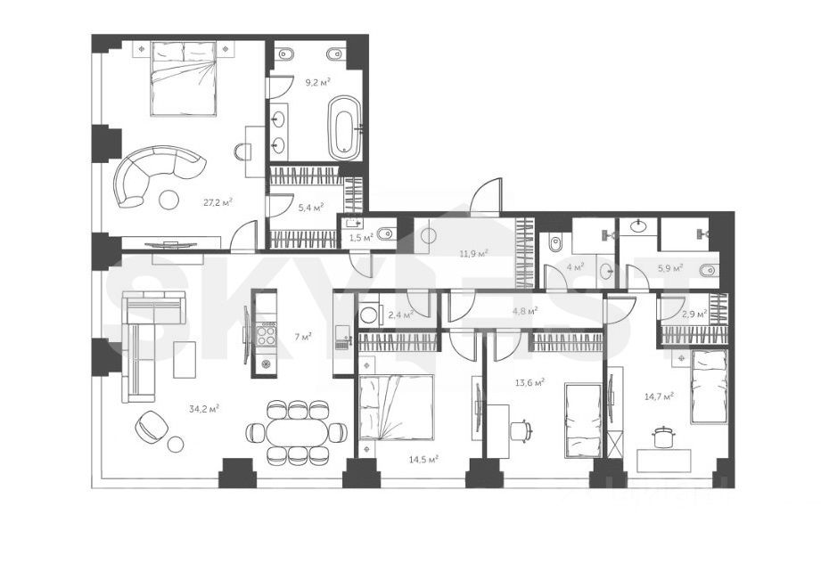 Планировка: кухня-гостиная, спальня с ванной комнатой и гардеробной, 3 спальни с ванными комнатами и гардеробными.