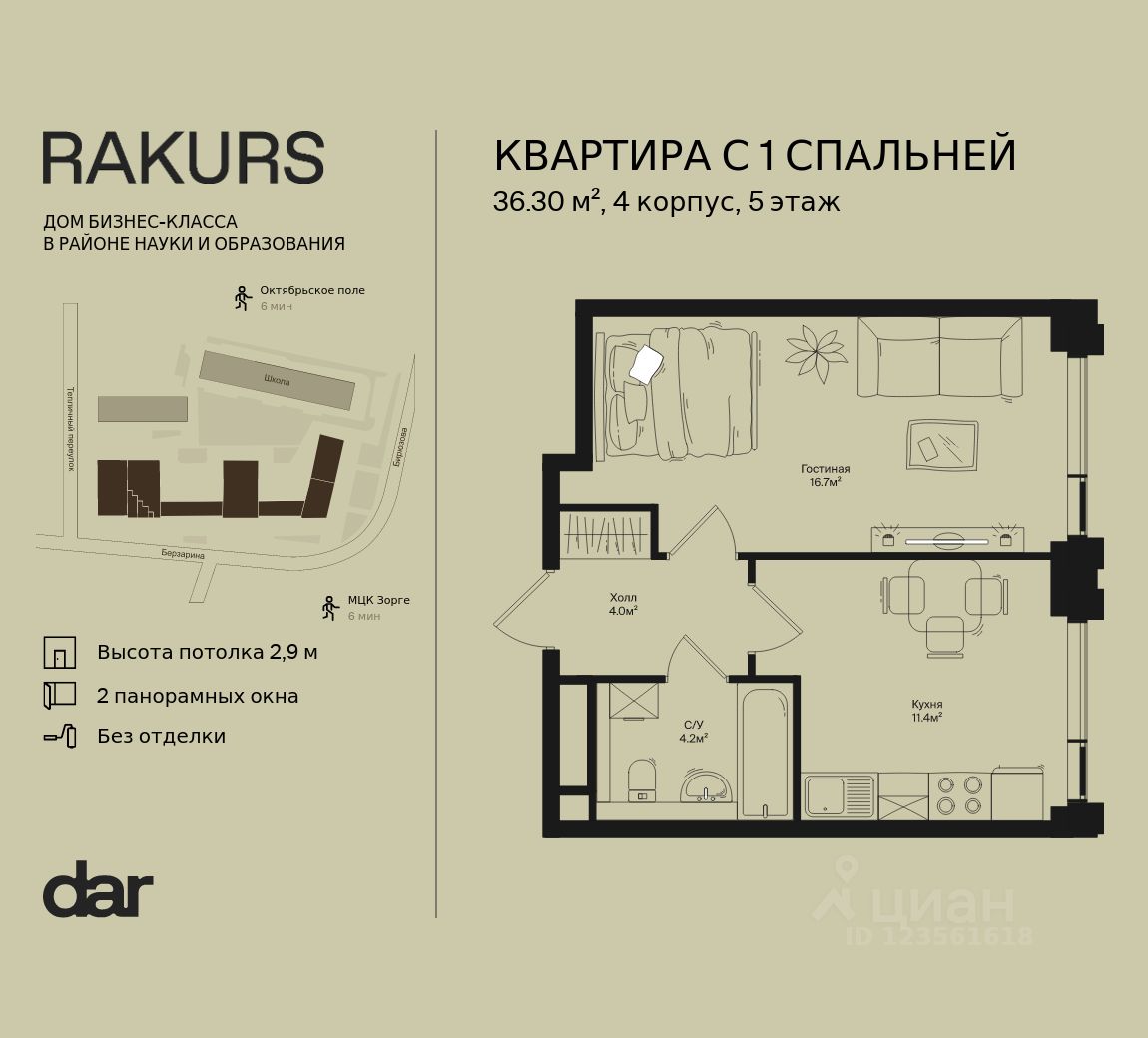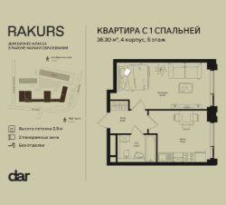 Продаётся 1-комнатная квартира 36.30 м² в жилом комплексе Ракурс. Квартиру отличают панорамное остекление, потолки 2,9 м, улучшенная шумо и воздухоизоляция. Дом сдаётся в 1 квартале 2028 года, продажи проходят через эскроусчета. Подземный паркинг, коворкинг, закрытая благоустроенная территория с фонтаном и артобъектами. Гибкие условия покупки.