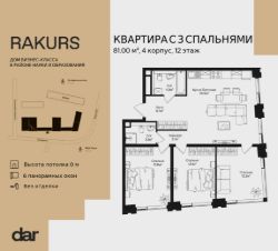 Продаётся 3-комнатная квартира 81.00 м² в жилом комплексе Ракурс. Квартиру отличают панорамное остекление, потолки [ceiling_height] м, улучшенная шумо и воздухоизоляция. Дом сдаётся в 1 квартале 2028 года, продажи проходят через эскроусчета. Подземный паркинг, коворкинг, закрытая благоустроенная территория с фонтаном и артобъектами. Гибкие условия покупки.