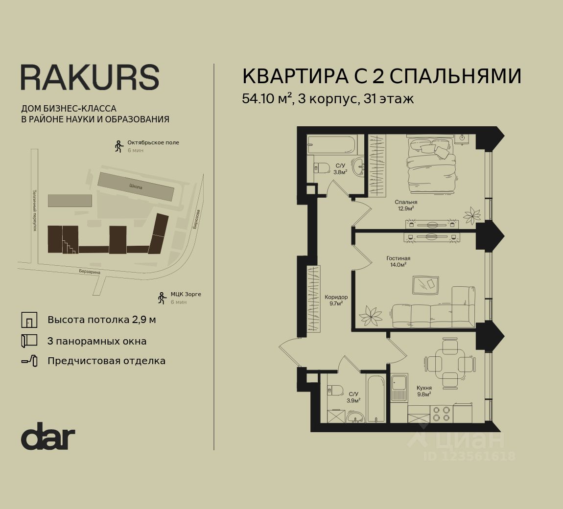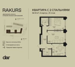 Продаётся 2-комнатная квартира 54.10 м² в жилом комплексе Ракурс. Квартиру отличают панорамное остекление, потолки 2,9 м, улучшенная шумо и воздухоизоляция. Дом сдаётся в 1 квартале 2028 года, продажи проходят через эскроусчета. Подземный паркинг, коворкинг, закрытая благоустроенная территория с фонтаном и артобъектами. Гибкие условия покупки.