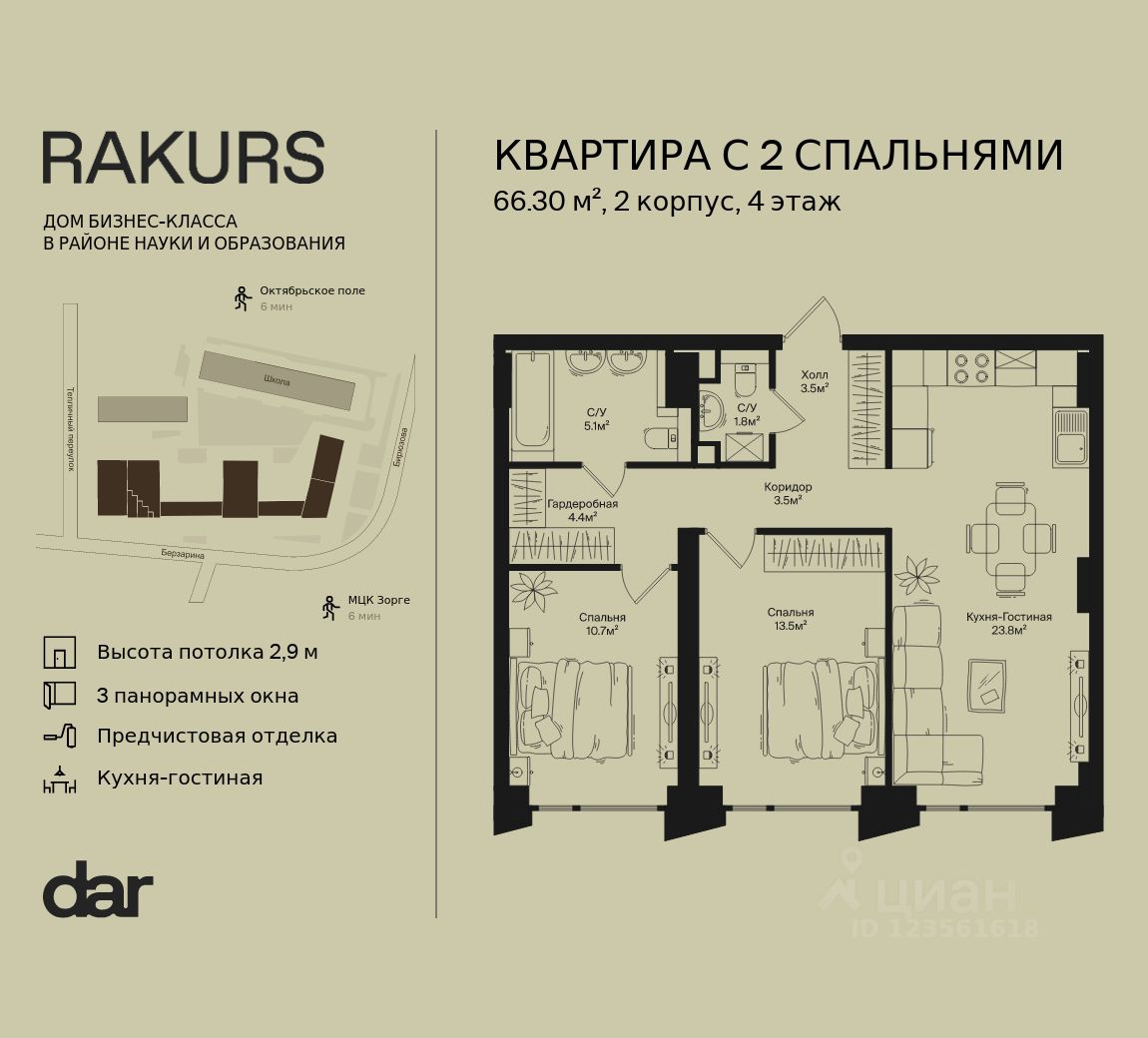 Продаётся 2-комнатная квартира 66.30 м² в жилом комплексе Ракурс. Квартиру отличают панорамное остекление, потолки 2,9 м, улучшенная шумо и воздухоизоляция. Дом сдаётся в 1 квартале 2028 года, продажи проходят через эскроусчета. Подземный паркинг, коворкинг, закрытая благоустроенная территория с фонтаном и артобъектами. Гибкие условия покупки. Rakurs — место, в котором жизнь приглашает к исследованию. Концепция проекта knowledge-centric среда, которая выражается здесь в образе жизни: • атмосфере интеллектуальной среды, • доступности образования, • фокусе на возможности для развития. RAKURS разместился в районе науки и окружен исследовательскими институтами и образовательными учреждениями, при этом на территории построена своя школа с уникальной концепцией. Расположенный на пересечении улиц Маршала Бирюзова и Берзарина, недалеко от станций метро "Октябрьское поле" и "Зорге", дом угождает транспортной доступностью автомобилистам и пешеходам. Инфраструктура же района создана с заботой о людях: здесь много парков, кафе и других уютных мест для отдыха. В состав комплекса входят три башни высотой 18, 26 и 44 этажа, каждая из которых имеет свой запоминающийся силуэт. Между собой башни связаны среднеэтажными строениями с индивидуальными фасадами. Композиция и пластика корпусов, а также панорамное остекление башен обеспечивают квартиры максимальным количеством дневного света и выигрышными видами на центр города и Москву-Сити. Упор на функциональность не лишает проект его уникального образа — все башни имеют неординарную форму с харизматичными уступами и консолями. Rakurs предлагает широкий выбор уникальных вариантов жилья — от студий до эксклюзивных квартир с приватными террасами. Проект спроектирован с фокусом на биофильность и функциональность. Во дворах Rakurs можно насладиться завтраком на террасе кафе, игрой с детьми или спортом на свежем воздухе. В Rakurse cвой комьюнити-центр - многофункциональное пространство для работы, отдыха, общения и развития. Одна из важнейших частей центра — частная библиотека с лаундж-зоной. Книжный фонд отбирается для нее кураторской командой, а дизайн пространства сделан так, чтобы жители могли почувствовать умиротворяющую атмосферу библиотечного зала. Идея knowledge-centric среды поддерживается здесь и книжным магазином с лекторием, а также зонами для самостоятельной учебы и занятий с преподавателями.