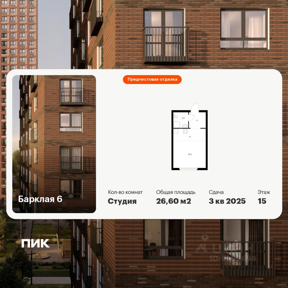Продаётся квартира-студия площадью 26,6 кв.м на 15 этаже 32 этажного дома (Корпус 8, Секция 3) проекта ПИК Барклая 6. Светлый просторный подъезд на уровне земли, функциональная планировка, большие окна, предчистовая отделка.