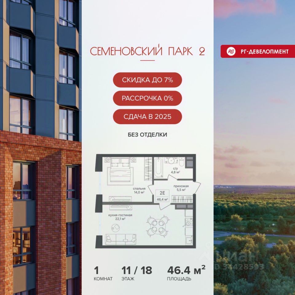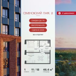 Продается 1-к квартира 46,4 кв.м. в ЖК "Семеновский парк 2" на 11-м этаже 18 этажного дома.