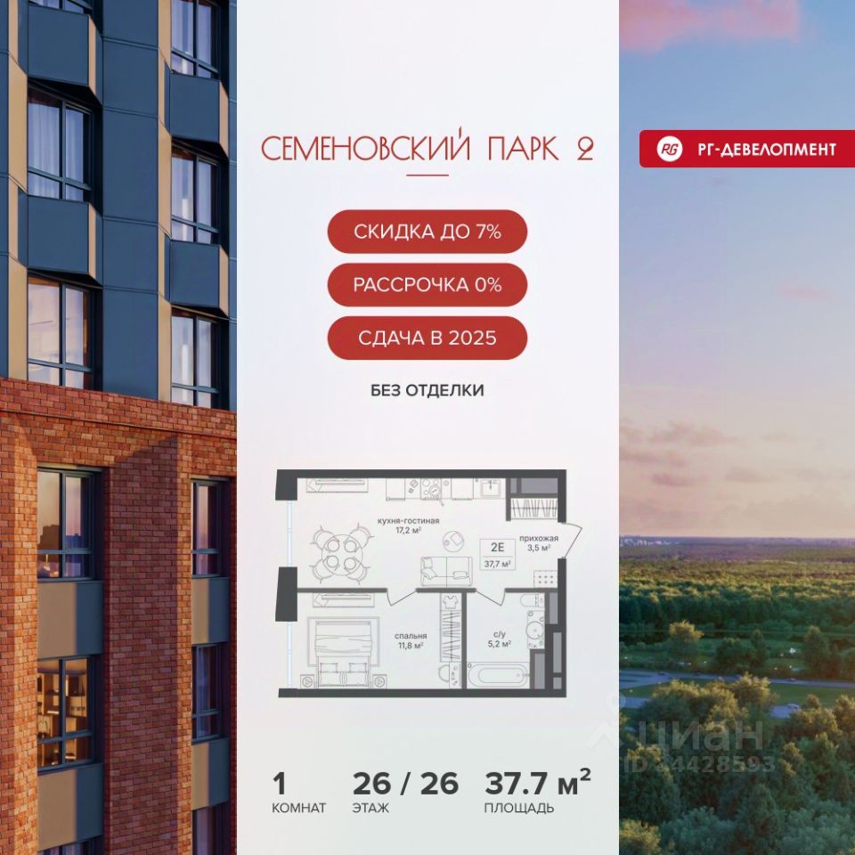 Продается 1-к квартира 37,7 кв.м. в ЖК "Семеновский парк 2" на 26-м этаже 26 этажного дома.