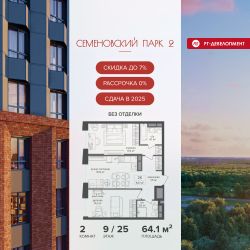 Продается 2-к квартира 64,1 кв.м. в ЖК "Семеновский парк 2" на 9-м этаже 25 этажного дома.