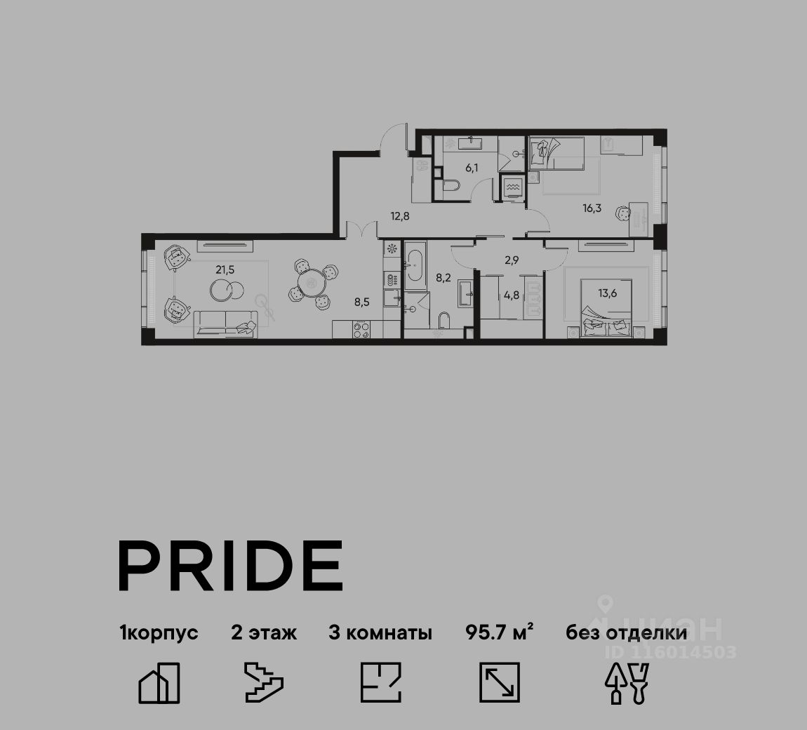 В премиальном жилом квартале PRIDE продается 3-комнатная квартира в 1 корпусе, на 2 этаже, в секции 4. Её общая площадь составляет 95.7 м². Пространство включает 2 уютные спальни 13,6 м², 16,3 м², просторную кухню-гостиную 30 м² и 2 ванные комнаты 6,1 м² и 8,2 м². Ключи в 2026 году.