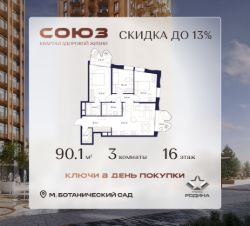 Продаётся 3-комнатная квартира площадью 90.1 м² на 16 этаже в Жилом Комплексе "Союз".