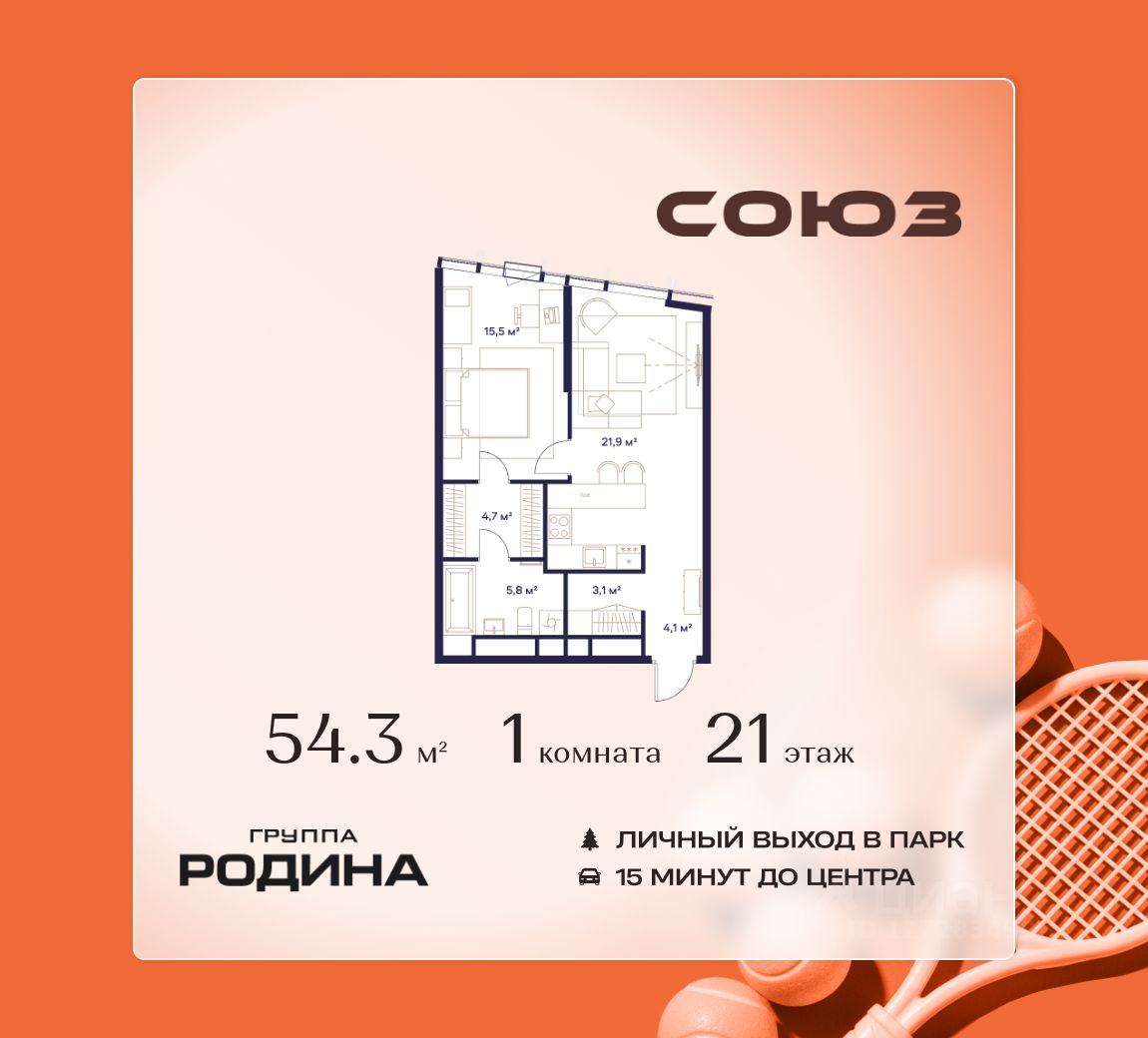 Продаётся 1-комнатная квартира площадью 54.3 м² на 21 этаже в Жилом Комплексе "Союз".