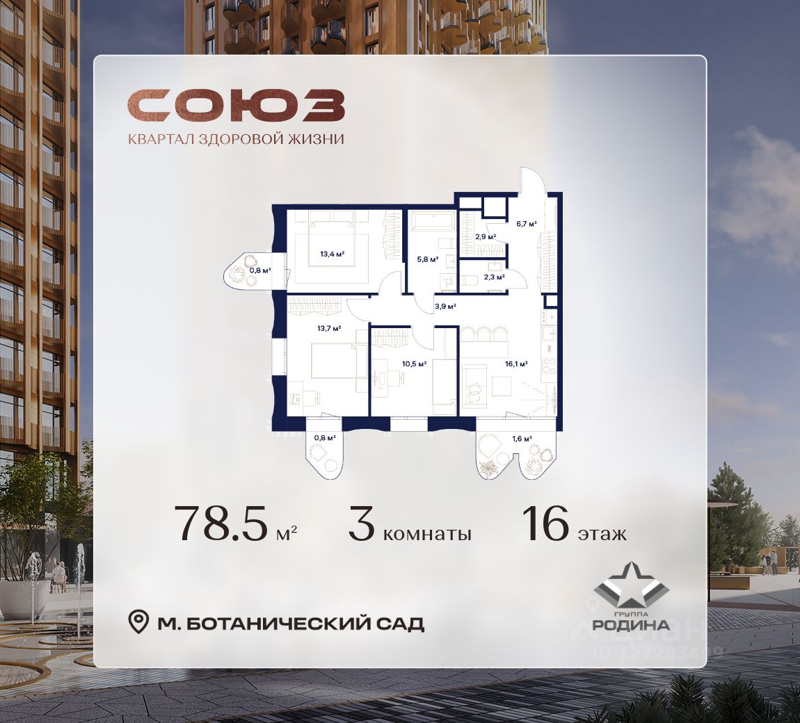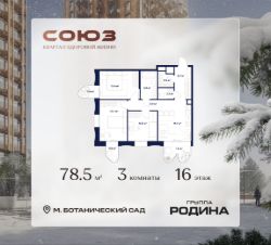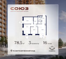 Продаётся 3-комнатная квартира площадью 78.5 м² на 16 этаже в Жилом Комплексе "Союз".