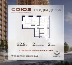 Продаётся 2-комнатная квартира площадью 62.9 м² на 2 этаже в Жилом Комплексе "Союз".