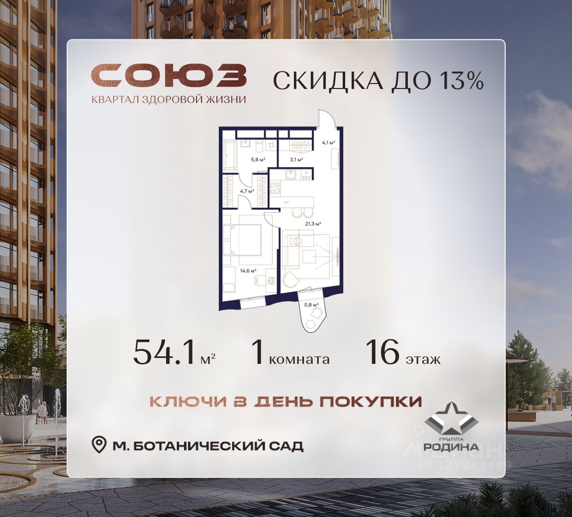 Продаётся 1-комнатная квартира площадью 54.1 м² на 16 этаже в Жилом Комплексе "Союз".