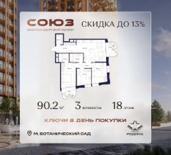Продаётся 3-комнатная квартира площадью 90.2 м² на 18 этаже в Жилом Комплексе "Союз".