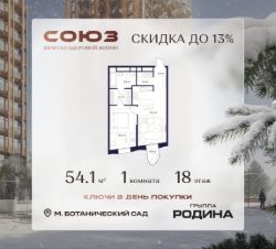 Продаётся 1-комнатная квартира площадью 54.1 м² на 18 этаже в Жилом Комплексе "Союз".