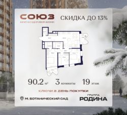 Продаётся 3-комнатная квартира площадью 90.2 м² на 19 этаже в Жилом Комплексе "Союз".