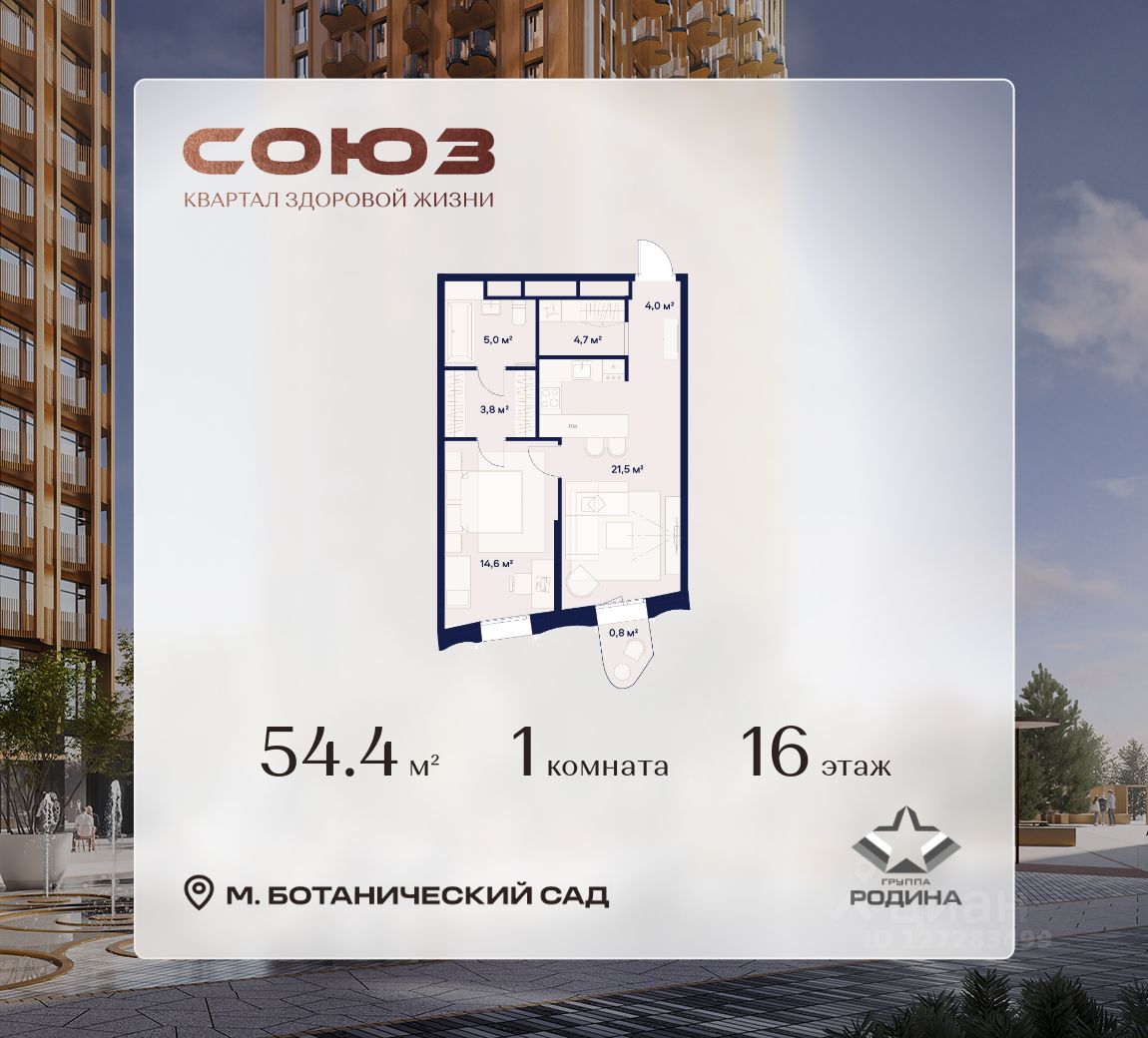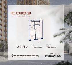 Продаётся 1-комнатная квартира площадью 54.4 м² на 16 этаже в Жилом Комплексе "Союз".