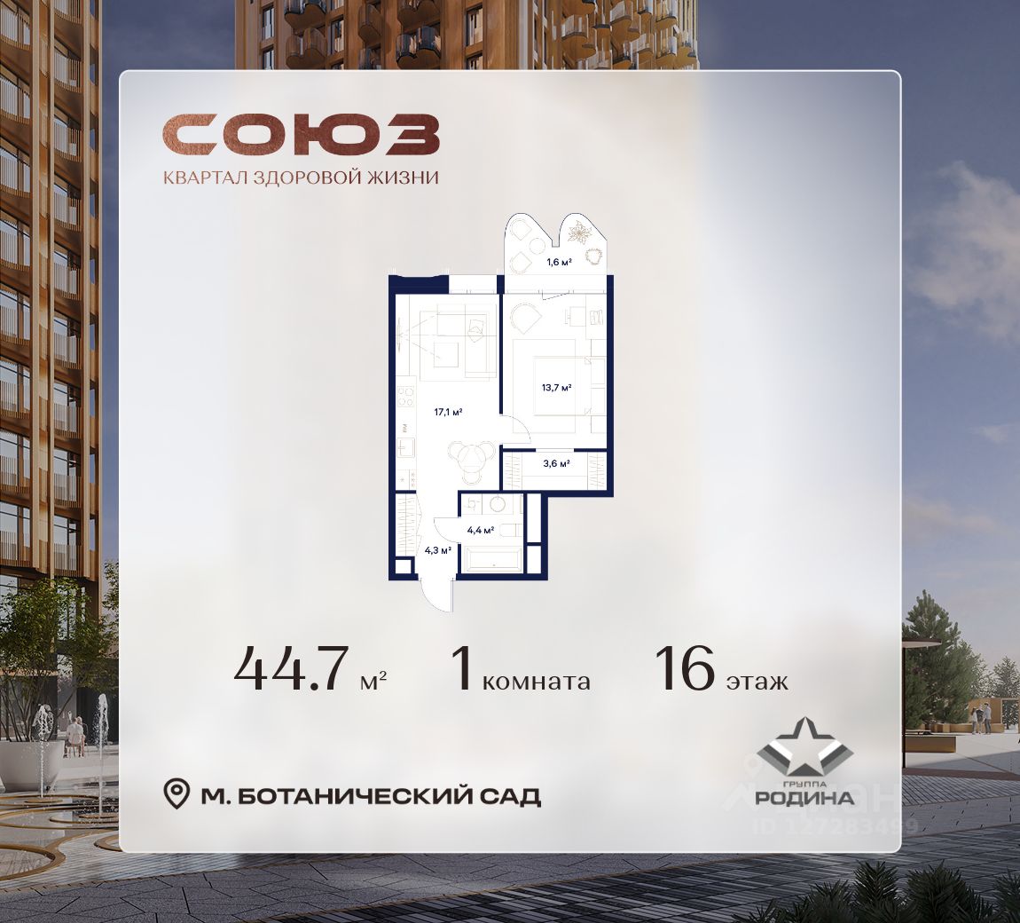 Продаётся 1-комнатная квартира площадью 44.7 м² на 16 этаже в Жилом Комплексе "Союз".