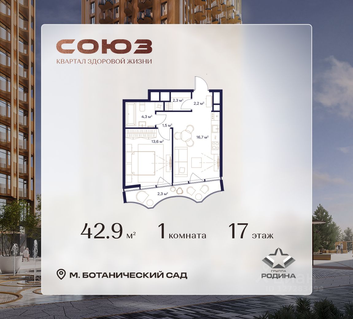 Продаётся 1-комнатная квартира площадью 42.9 м² на 17 этаже в Жилом Комплексе "Союз".