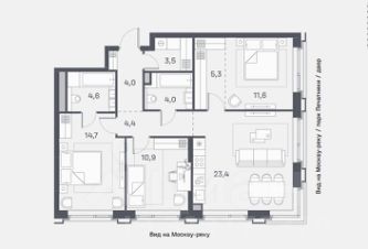 Все окна- с видом на реку. Кухня -гостиная с тремя окнами (одно из них- с угловым остеклением).