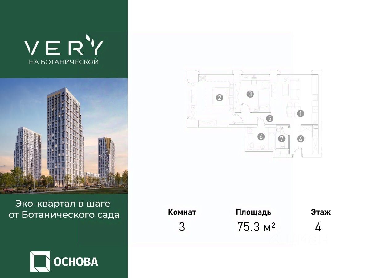 Продается 3-к квартира площадью 75.3 кв.м. на 3-м этаже 31 этажного дома в ЖК "Very" от ГК ОСНОВА.
