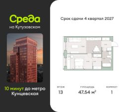 Продаётся 1-комнатная квартира общей площадью 47.54 кв.м. с отделкой white box. Квартира расположена на 13 этаже корпуса 5 в жилом комплексе бизнес-класса "Среда на Кутузовском" в пешей доступности от метро "Кунцевская".