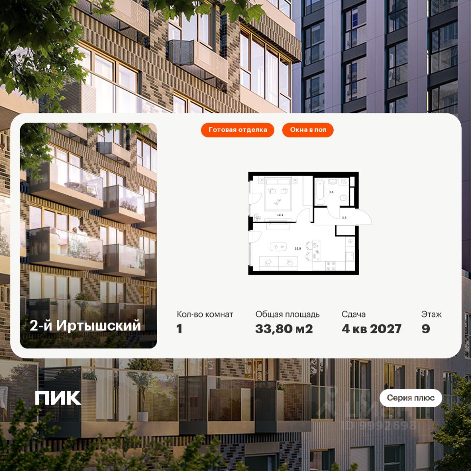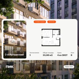 Продаётся 1-комн. квартира площадью 33,8 кв.м на 9 этаже 9 этажного дома (Корпус 1.6, Секция 6) проекта ПИК 2-й Иртышский. Светлый просторный подъезд на уровне земли, функциональная планировка, большие окна, c отделкой.
