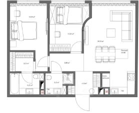 Площадь 72 м2. Планировка: просторная кухня-гостиная, мастер-спальня с ванной и гардеробной комнатам, детская спальня, с/у, гардеробная.