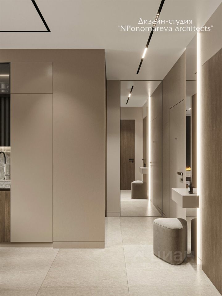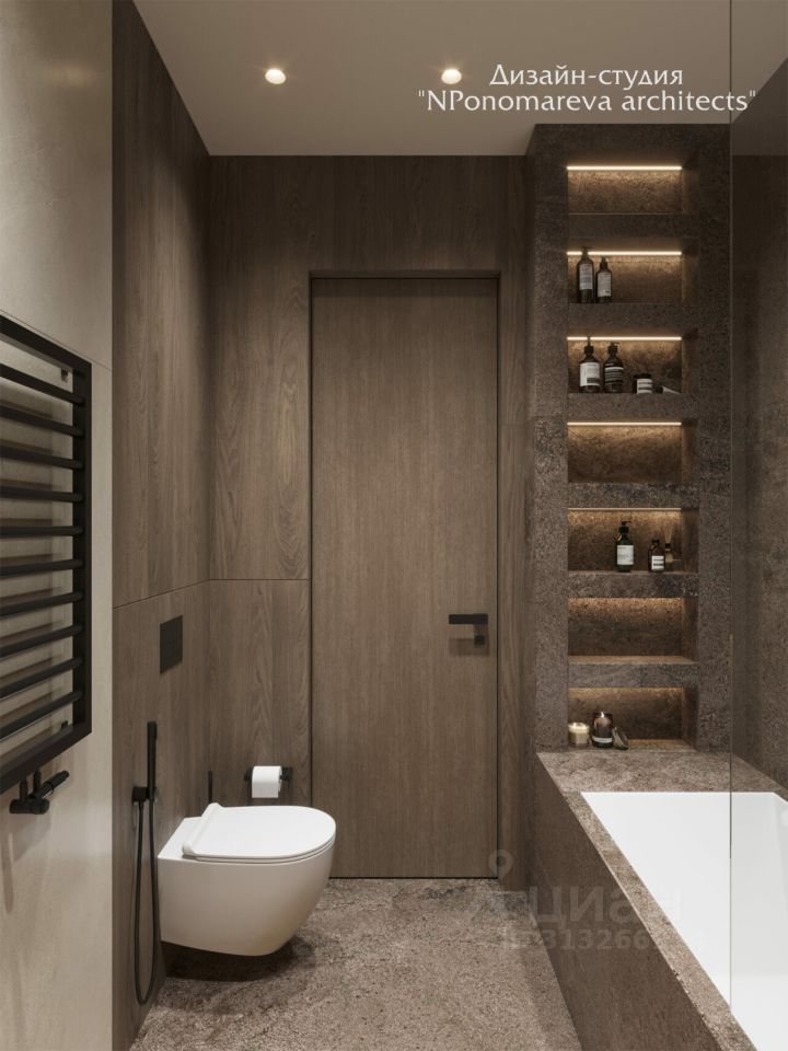 Выполнена авторская отделка от ведущей архитектурной студии Москвы с применением натурального дерева и камня.
