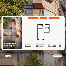 Продаётся квартира-студия площадью 28,1 кв.м на 13 этаже 32 этажного дома (Корпус 3.6, Секция 3) проекта ПИК Кавказский бульвар 51. Светлый просторный подъезд на уровне земли, функциональная планировка, большие окна, c отделкой.