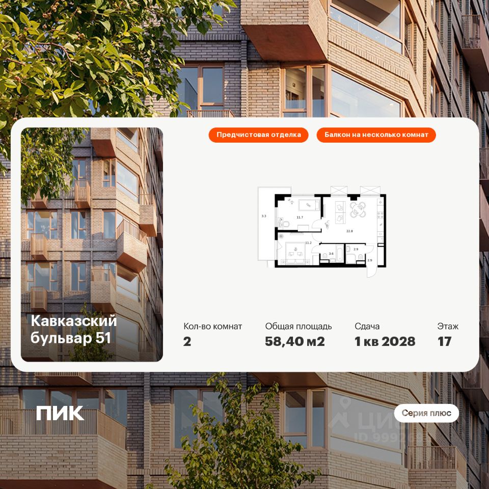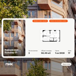 Продаётся 2-комн. квартира площадью 58,4 кв.м на 17 этаже 24 этажного дома (Корпус 3.5, Секция 2) проекта ПИК Кавказский бульвар 51. Светлый просторный подъезд на уровне земли, функциональная планировка, большие окна, предчистовая отделка.