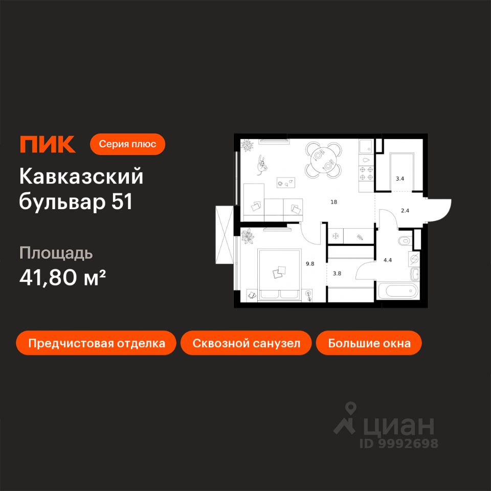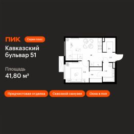 Продаётся 1-комн. квартира площадью 41,8 кв.м на 24 этаже 24 этажного дома (Корпус 3.5, Секция 2) проекта ПИК Кавказский бульвар 51. Светлый просторный подъезд на уровне земли, функциональная планировка, большие окна, предчистовая отделка.